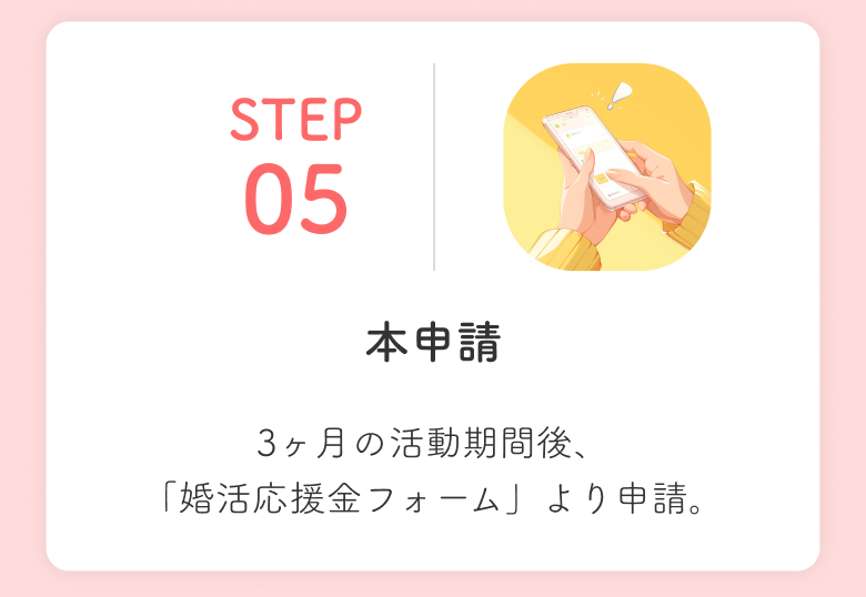 婚活応援金は本申請から3か月以内に、指定いただいた銀行口座へお振込みいたします。