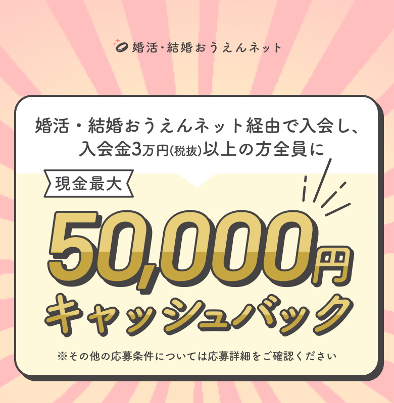 婚活・結婚おうえんネットでは、婚活・結婚おうえんネット経由で結婚相談所へ入会し、入会金が3万円(税抜)以上の方全員に、婚活応援金キャンペーンとして現金最大50,000円キャッシュバックを実施中です。