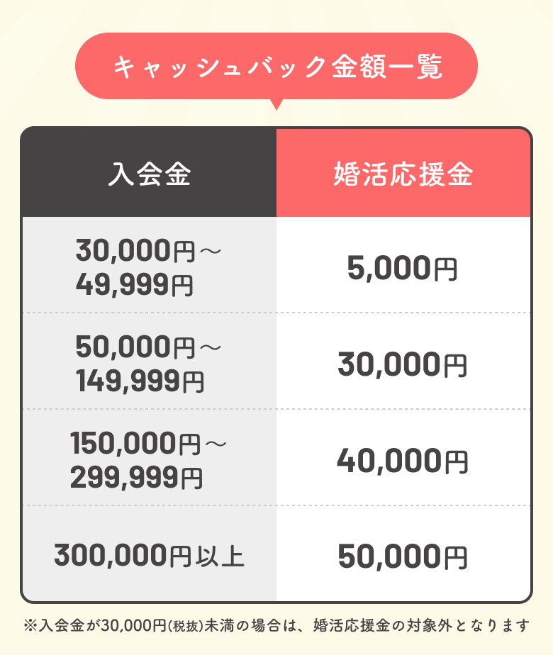 入会金が30,000円(税抜)未満の場合は、婚活応援金キャンペーンの対象外となりますのでご了承ください。